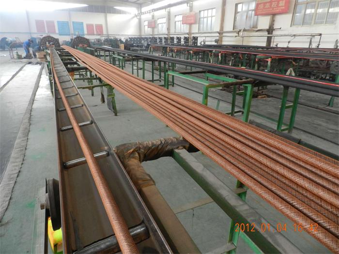 高壓鋼絲纏繞膠管的生產(chǎn)工藝流程:丁腈膠熟煉→內(nèi)膠層壓出→套管(鐵芯擦硅油)→纏窗紗(窗紗整理切割后纏繞在套管上)→壓上一層中膠→纏繞上第一層鋼絲→上二層中膠→纏繞上第二層鋼絲→上第三層中膠→纏...